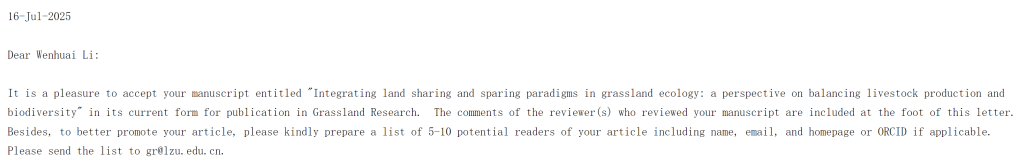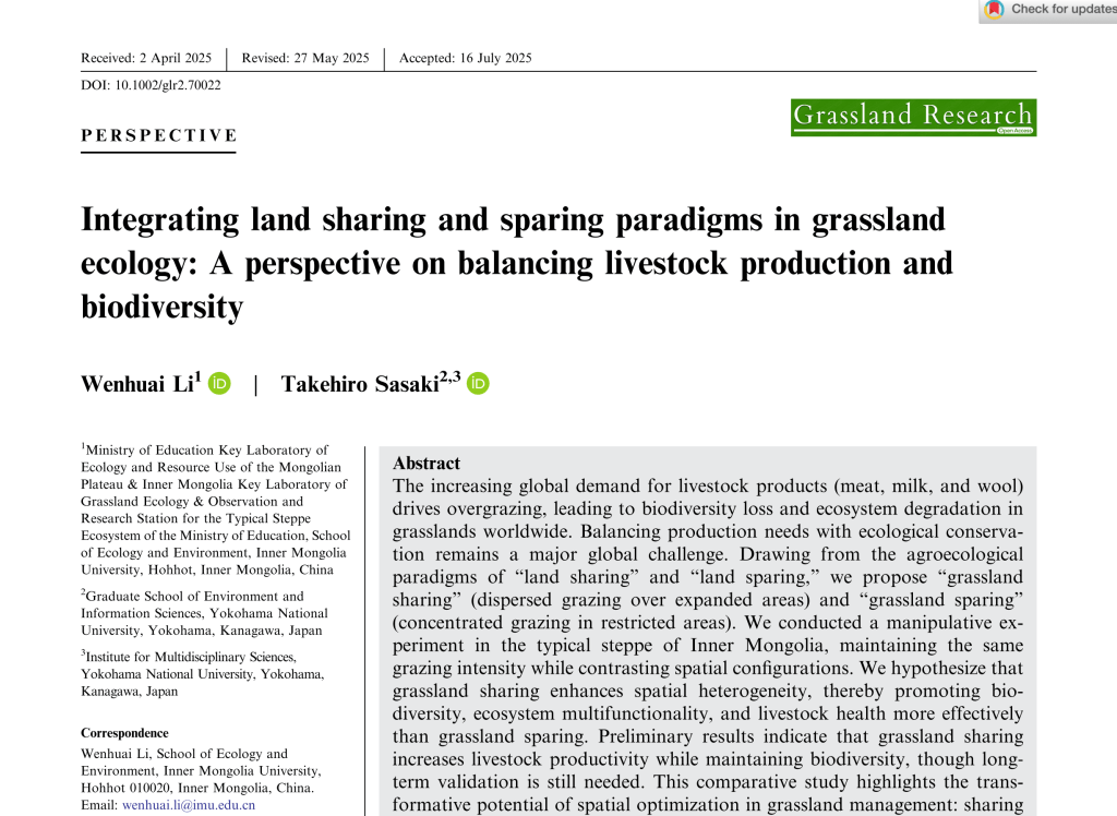 Happy to know that the article I co-authored with Professor Takehiro Sasaki, titled ‘Integrating land sharing and sparing paradigms in grassland ecology: a perspective on balancing livestock production and biodiversity,’ has been accepted by Grassland Research.